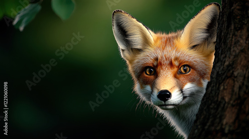 © godex, Fototapeta premium Red Fox Peek-a-Boo: A curious red fox with striking orange fur and intense amber eyes peeks from behind a tree trunk, creating a captivating moment of wildlife intrigue.