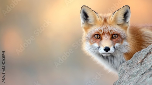 Obraz premium Red fox peering from rocks at sunset, autumnal forest background, wildlife photography for nature publications