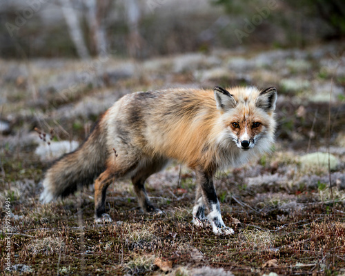 Fototapeta premium Red Fox Photo Stock. Fox Image. Close-up profile side view looking at camera with a blur forest background in its environment and habitat. Picture. Portrait.