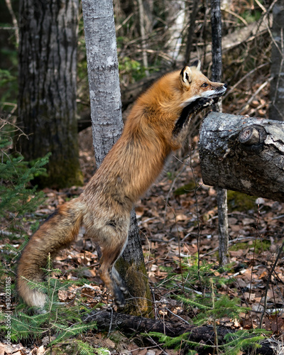 © Aline, Fototapeta premium Red Fox Photo Stock. Fox Image. Jumping on a log in the forest with blur forest background in its environment and habitat. Picture. Portrait. Photo