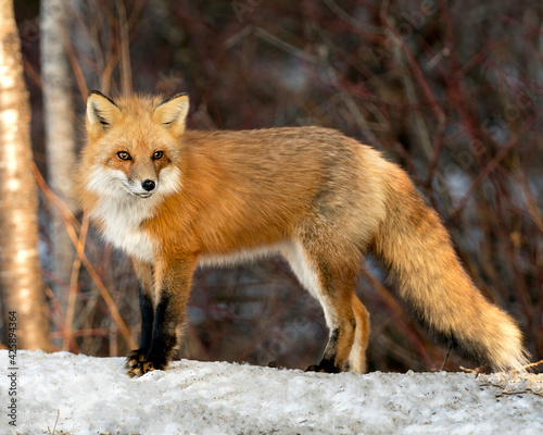 Naklejka premium Red Fox Photo Stock. Fox Image. Looking at camera in the winter season in its environment and habitat with blur forest background displaying bushy fox tail, fur. Picture. Portrait.