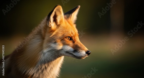 © Nuri_Studio, Fototapeta premium Red fox portrait, side view, golden light, dark background, keen gaze, detailed fur