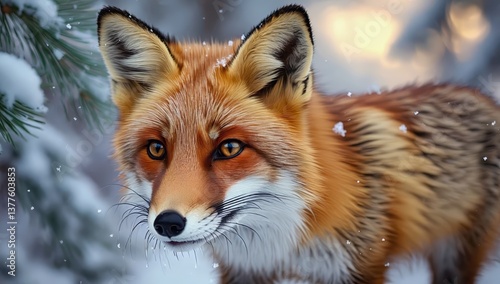 Fototapeta premium Red Fox Portrait with Soft Snowy Forest Bokeh Background - Made with...