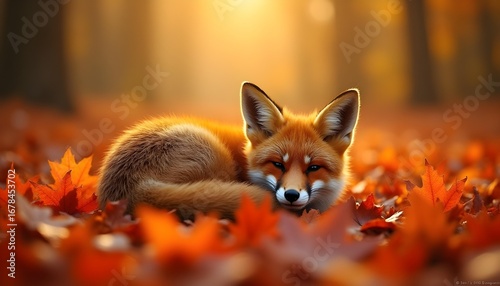 © Ai Technology, Obraz premium Red fox resting amongst vibrant autumn leaves in warm sunlight