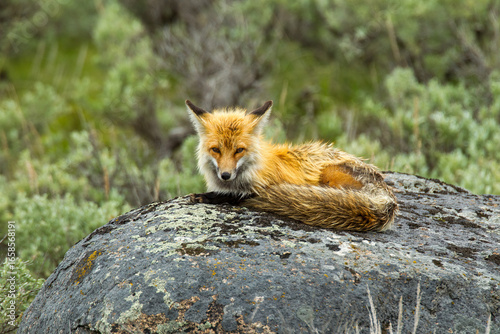Obraz premium Red Fox resting on rock taken in Yellowstone NP