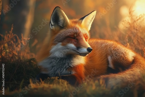 © Ifti Digital, Obraz premium Red fox resting peacefully in the wild during early morning light, Red fox Vulpes vulpes A fox is resting in the wild
