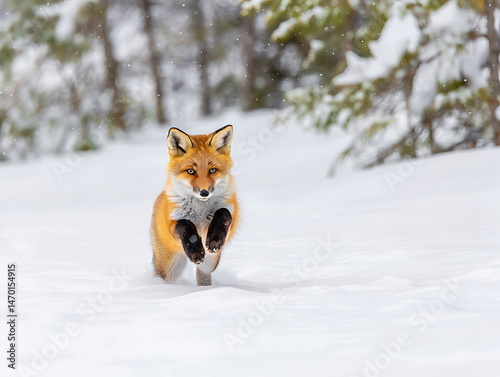 © klimoha237, Obraz premium Red Fox Sitting in a Snowy Winter Landscape with Evergreen Trees