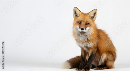 © Benjamin, Fototapeta premium red fox sitting with its tail curled around its body, staring attentively against a clean white backdrop