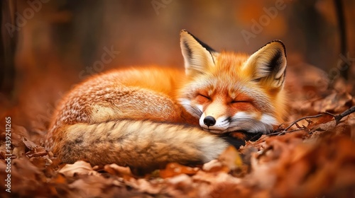 Naklejka premium Red fox sleeping autumn leaves forest wildlife