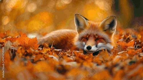 © Aziz, Fototapeta premium Red fox sleeping peacefully amidst autumn leaves.
