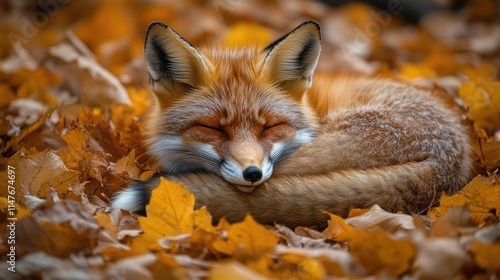 © Aziz, Fototapeta premium Red fox sleeping peacefully amidst autumn leaves.