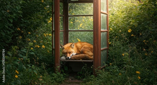 © Ariestia, Obraz premium Red fox sleeping peacefully inside an overgrown, abandoned outdoor communication booth