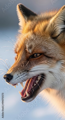 © photoplotnikov, Fototapeta premium Red fox snarling showing teeth in snowy close portrait