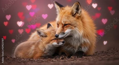 Fototapeta premium Red fox snuggles her cub against a heart bokeh background