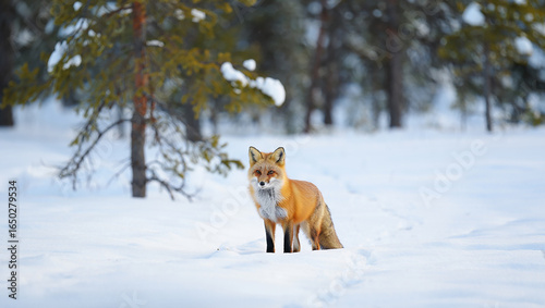 Obraz premium Red fox standing in a snowy winter forest with pine trees