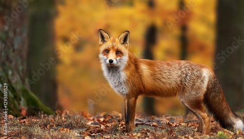 © netsay, Fototapeta premium Red Fox Standing in Autumnal Forest Striking Vixen Amidst Vibrant Fall Foliage, Capturing the Majestic Beauty of Nature in a Serene Moment.