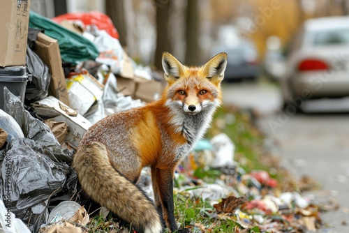 Naklejka premium Red Fox Standing in Front of a Pile of Garbage
