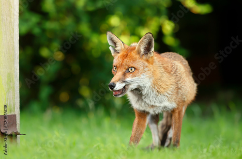 © giedriius, Fototapeta premium Red fox standing in grass by a fence
