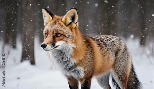 Obraz premium Red fox standing in snowy forest - ultra realistic photo