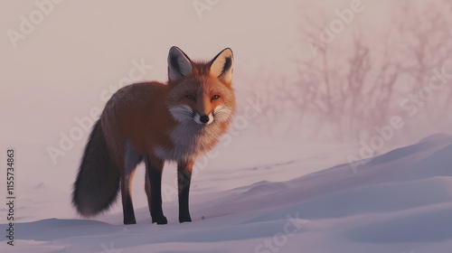 Fototapeta premium Red fox standing in snowy landscape during twilight showcasing its beauty and...