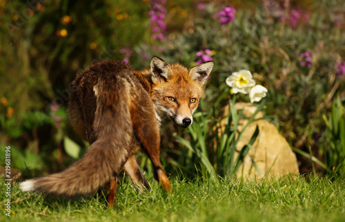 © giedriius, Obraz premium Red Fox standing in the garden with flowers