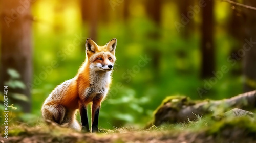 © ardanz, Fototapeta premium Red fox standing on a rock in the peaceful forest and looking at something, generative ai illustration
