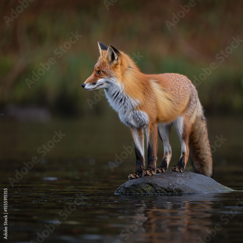 © Hasanur Rayhan, Fototapeta premium Red fox standing on a rock in the water looking alert