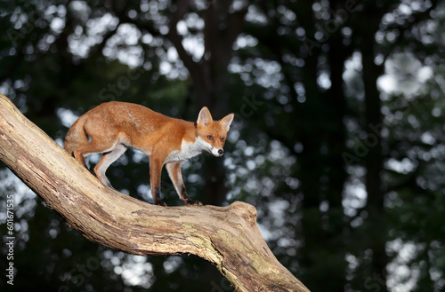 Fototapeta premium Red fox standing on a tree trunk in a forest