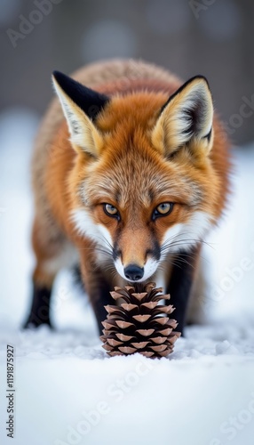 Fototapeta premium Red fox standing on snow with pinecone in focus, winter wildlife.Confidence....