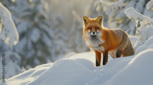 Fototapeta premium Red fox standing on snowy ground in winter forest