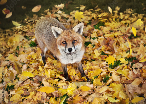 © giedriius, Obraz premium Red fox standing on the grass covered with autumn leaves