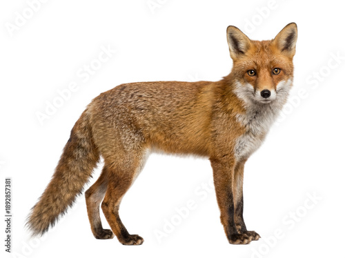 © Trixy, Naklejka premium Red fox standing, side view, isolated on transparent background (PNG)