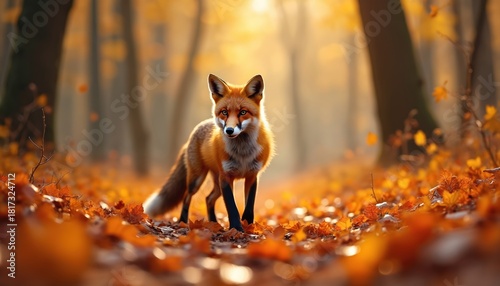 © Pete, Naklejka premium Red fox stands alert in forest amidst fallen leaves. Sunlit autumn foliage creates warm glow. Wildlife observes surroundings in natural habitat.