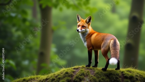 © Gayan, Obraz premium Red Fox Stands Atop Mossy Knoll
