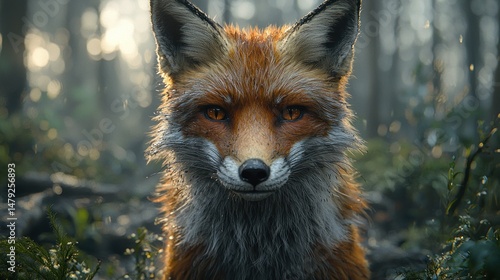 © Rania, Fototapeta premium Red fox stares intently in misty forest