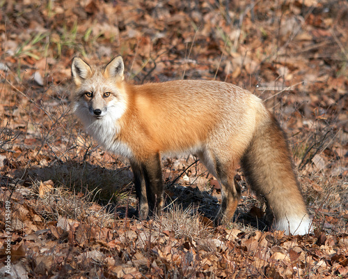 Naklejka premium Red Fox Stock Photo. Fox Red fox animal on a in the forest background. Autumn season leaves background and foreground. Bushy tail. Portrait. Picture. Image. Photo.