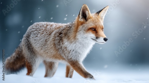 © Ilja, Naklejka premium Red Fox Strolling Gracefully Through a Beautiful Winter Wonderland Covered in Fresh Snow