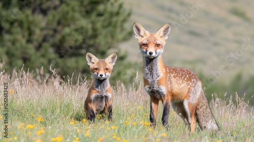 © tugkiara, Fototapeta premium Red fox vixen and kit in mountain meadow