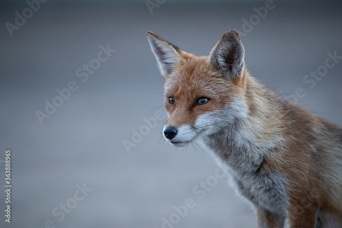 © L Galbraith, Fototapeta premium Red fox vixen headshot with grey background.
