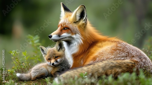 © azi, Fototapeta premium Red fox vixen lovingly cradling her adorable kit in a lush green forest.