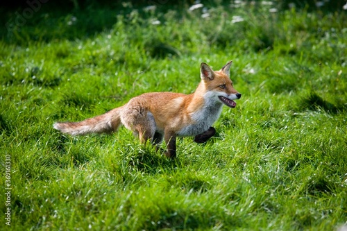 Fototapeta premium RED FOX vulpes vulpes, ADULT RUNNING THROUGH MEADOW, NORMADY