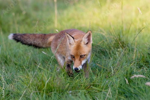 © slowmotiongli, Fototapeta premium Red Fox, vulpes vulpes, Adult standing on Grass, Normandy