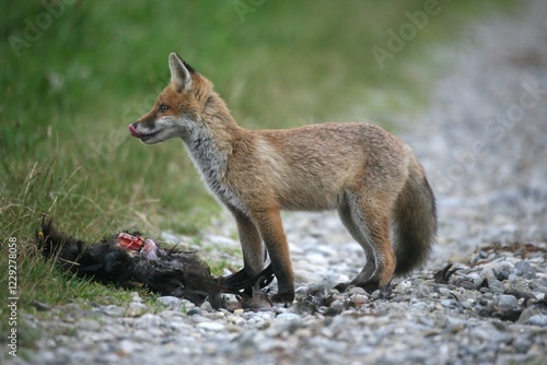 © Dieter Hopf/imageBROKER, Fototapeta premium Red Fox (Vulpes vulpes) and the remains of a domestic fowl