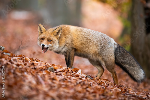 Obraz premium Red fox, vulpes vulpes, chewing with open mouth in autumn forest among fallen...