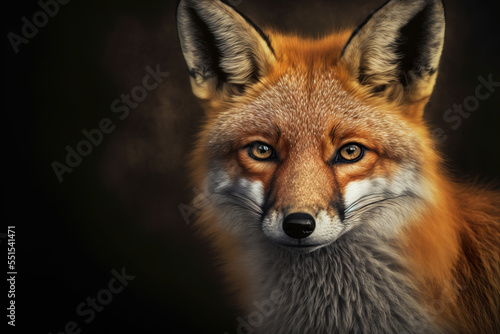 © Katynn, Fototapeta premium Red Fox - vulpes vulpes, close-up portrait with bokeh in the background. Making eye contact. Digital art