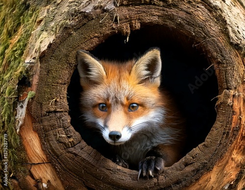 © RR 27, Fototapeta premium Red fox (Vulpes vulpes) in a hollow tree trunk