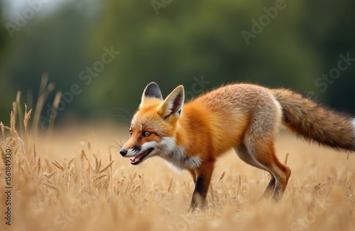 © Vadym, Fototapeta premium Red fox, Vulpes vulpes, in natural habitat hunts voles on field after corn harvest. Beautiful orange fur animal with long fluffy tail. Wildlife beast during summer nature scene.