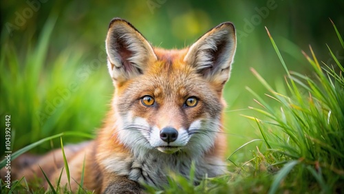 © Sayfar, Obraz premium Red fox Vulpes vulpes laying in the grass Extreme Close-Up