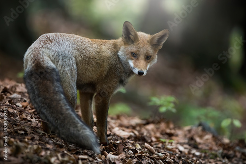 Obraz premium Red fox, vulpes vulpes, looking over the shoulder in forest in autumn. Furry...