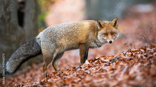 © WildMedia, Obraz premium Red fox, vulpes vulpes, looking to the camera on leaves in autumn nature. Orange predator standing in forest in fall season. Wild mammal with angry sight watching on foliage.